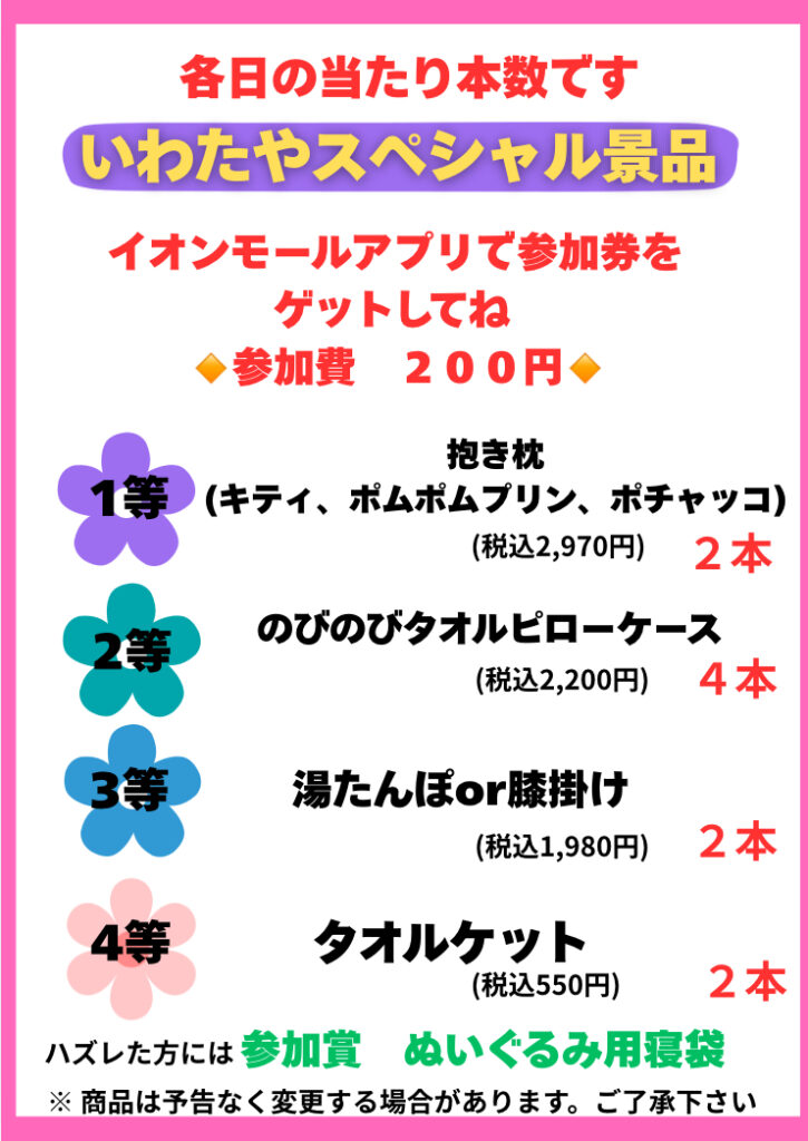 2026.03.01 いわたやでガチャガチャやります! イオン株式会社化100周年おめでとうございます!めでたいので、いわたやでガチャガチャやります!イオンモールアプリクーポンご使用で参加費200円。4日間限定!皆様のご参加お待ちしております。